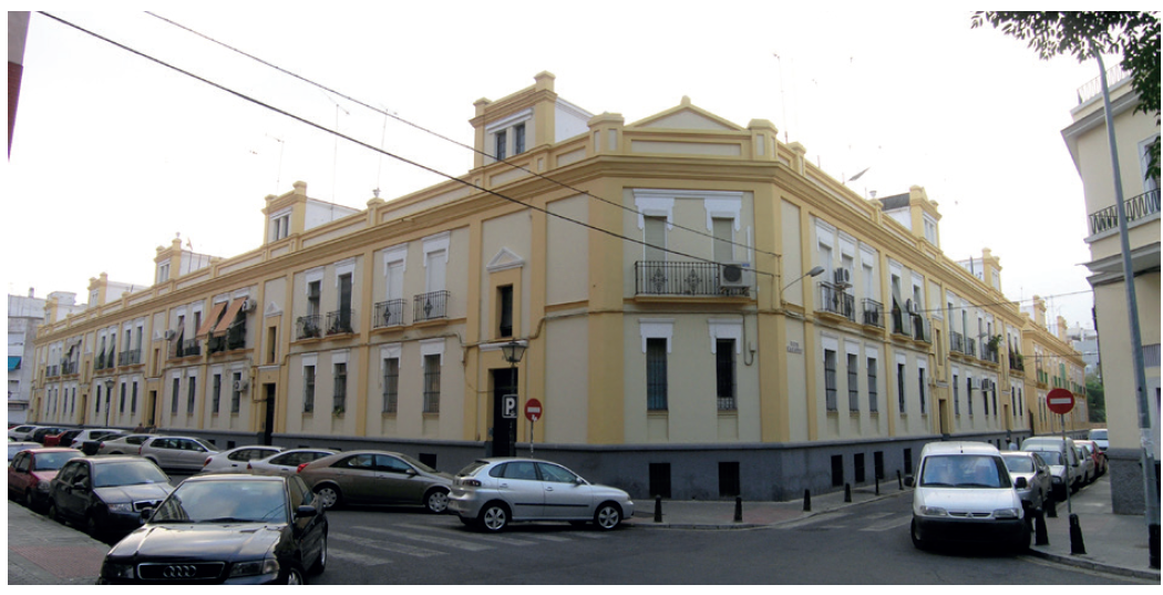 La Manzana de Pinillos, proyectada en 1922 por el arquitecto Antonio Arévalo e integrada en el ensanche de San Roque–Santa Justa, es uno de los mejores ejemplos conservados en Sevilla de manzana cerrada en ensanche.