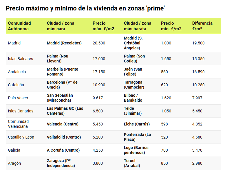 Por primera vez, nueve ciudades españolas superan los 6.000 euros por m2 en sus zonas ‘prime’, es decir, en los enclaves residenciales de mayor valor dentro de cada localidad. Madrid encabeza el ranking con el barrio de Recoletos, donde el precio máximo alcanza los 20.500 euros/m2, tras un incremento del 7,9% en un solo año. Le siguen Marbella, con 17.150 euros/m2 en Puente Romano, y Palma de Mallorca, que llega a los 17.000 euros/m2 en Nou Llevant.