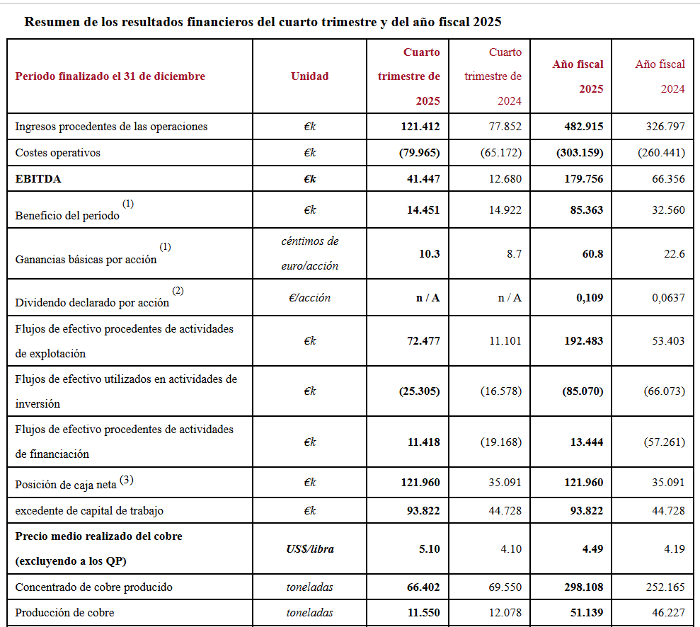 La captación de capital realizada en enero de 2026 ha fortalecido aún más la posición financiera de Atalaya y proporciona una flexibilidad significativa para impulsar nuestros proyectos de crecimiento de cobre en España. De cara al futuro, si bien el inicio de 2026 se ha visto afectado por las difíciles condiciones meteorológicas en Riotinto, mantenemos la confianza en nuestras previsiones de producción para el año y en el potencial de crecimiento a medio plazo de nuestra cartera. Con un sólido balance, activos de alta calidad y fundamentos favorables para el cobre a largo plazo , Atalaya está bien posicionada para alcanzar nuestros objetivos de 2026″.