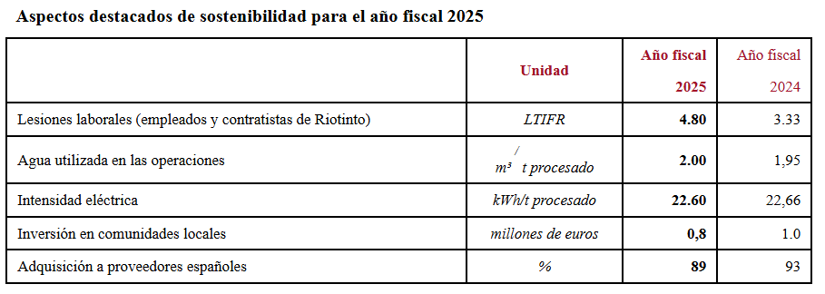 Continuamos invirtiendo en el desarrollo a largo plazo de nuestros activos, con una inversión sostenida en Riotinto, mayores avances en Masa Valverde y Proyecto Touro, y resultados de exploración alentadores, lo que refuerza el potencial de crecimiento y las opciones de nuestra cartera de activos. Al mismo tiempo, mantuvimos nuestro compromiso con la sostenibilidad, incluyendo acciones específicas para mejorar el desempeño en materia de seguridad y un enfoque en la mejora continua en relación con la eficiencia energética e hídrica».