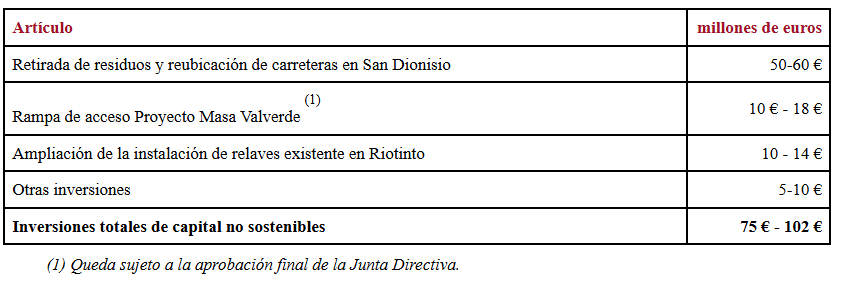La compañía planea realizar las siguientes inversiones de capital no recurrentes en el año fiscal 2026, destacando los entre 10 y 14 millones de euros en la ampliación de las presas de residuos mineros: