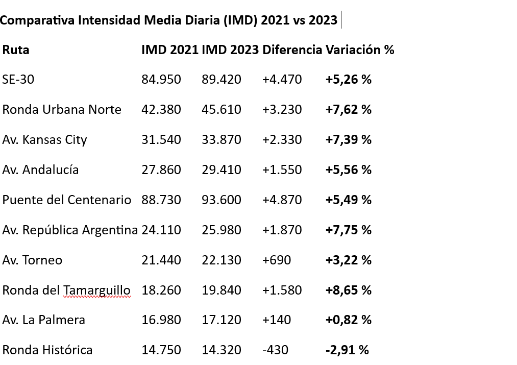En resumen, entre 2021 y 2023 la circulación en Sevilla ha aumentado en la mayoría de las rutas medidas por IMD, con especial intensidad en grandes ejes y accesos.