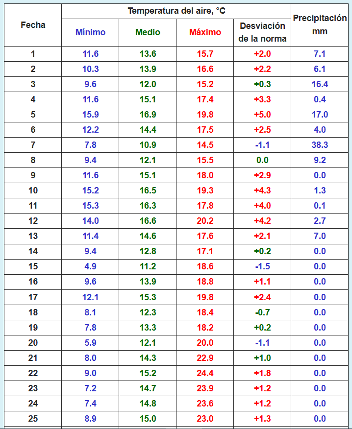 La temperatura mínima más baja (4,9 grados) se registró el día 15.