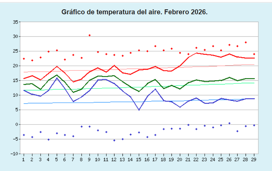 En cuanto a las temperaturas, la media normal para febrero es de 12,7º. La registrada en febrero del año en curso ha sido de 14,3º, es decir 1,6º superior a la habitual.