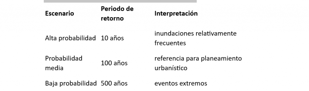 En los mapas de peligrosidad del sistema estatal -que utilizan la misma metodología hidrológica de la CHG- esto significa escenario de probabilidad media (T=100 años). La probabilidad anual aproximada, 1 % de inundación. Es el escenario utilizado normalmente para la planificación territorial y urbanística.