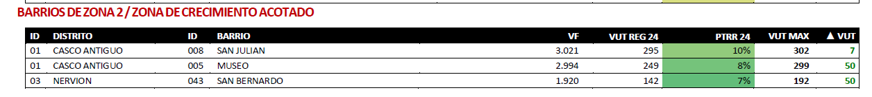 Con la excepción del Casco Histórico, por las razones explicadas anteriormente, y Bellavista-La Palmera, en que esta vez no se ha registrado ninguna nueva vivienda de uso turístico, el resto se reparte a razón de una en cada distrito y dos en Nervión.