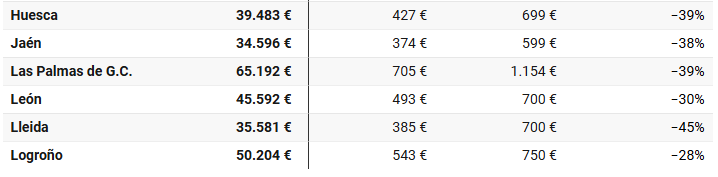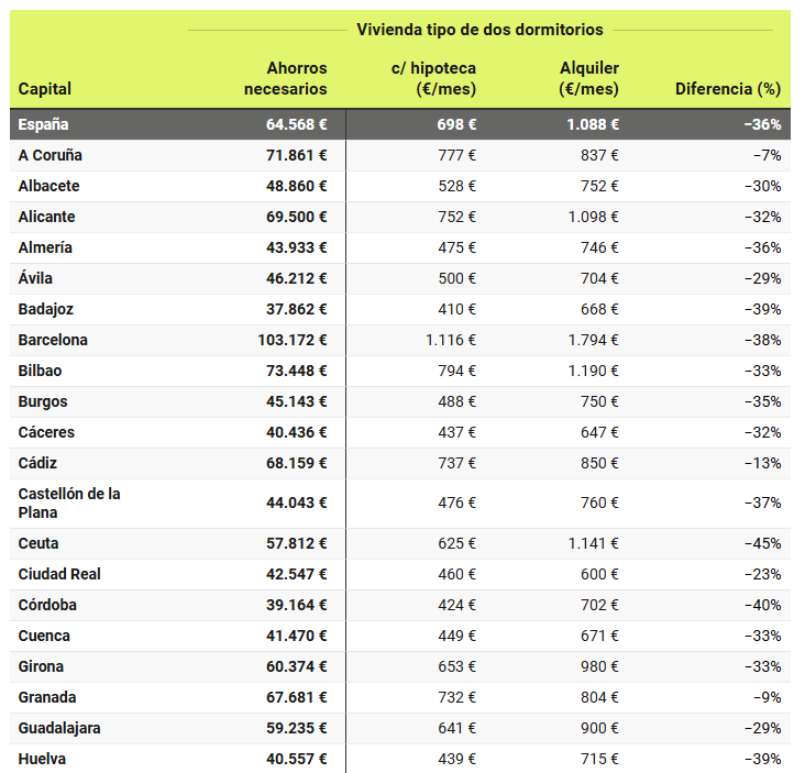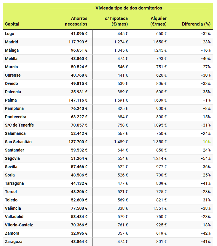 En todas las capitales españolas, la cuota hipotecaria, una vez obtenidos los ahorros necesarios, es más baja que el alquiler, con la excepción de San Sebastián, donde la cuota es un 10% más cara. La mayor diferencia entre el coste de comprar y alquilar se da en la ciudad de Segovia, con unas cuotas un 54% más que un alquiler, seguida por las ciudades de Ceuta y Lleida (cuotas un 45% más baratas). Con un 40% o más de diferencia están Zamora (-42%), Tarragona (-41%), Zaragoza (-41%), Melilla (-40%) y Córdoba (-40%).