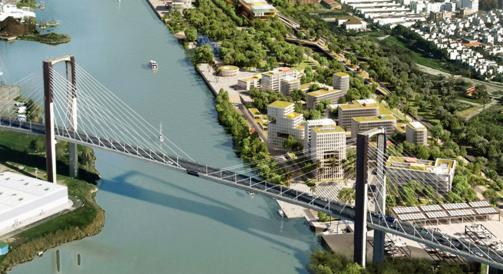 Recreación del Distrito Urbano Portuario, con la torre de 65 metros de alta junto al puente de las Delicias (a la izquierda)