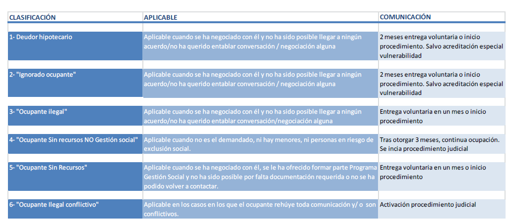 –Viviendas con ocupantes tras finalizar su contrato (8 unidades): En estos casos, se trata de antiguos inquilinos legales cuyo título ha expirado pero que no han abandonado el inmueble. El protocolo establecido por la empresa vendedora, Inmo Criteria Arrendamiento (grupo La Caixa), obliga al comprador del inmueble a intentar una salida negociada antes de iniciar el desalojo.