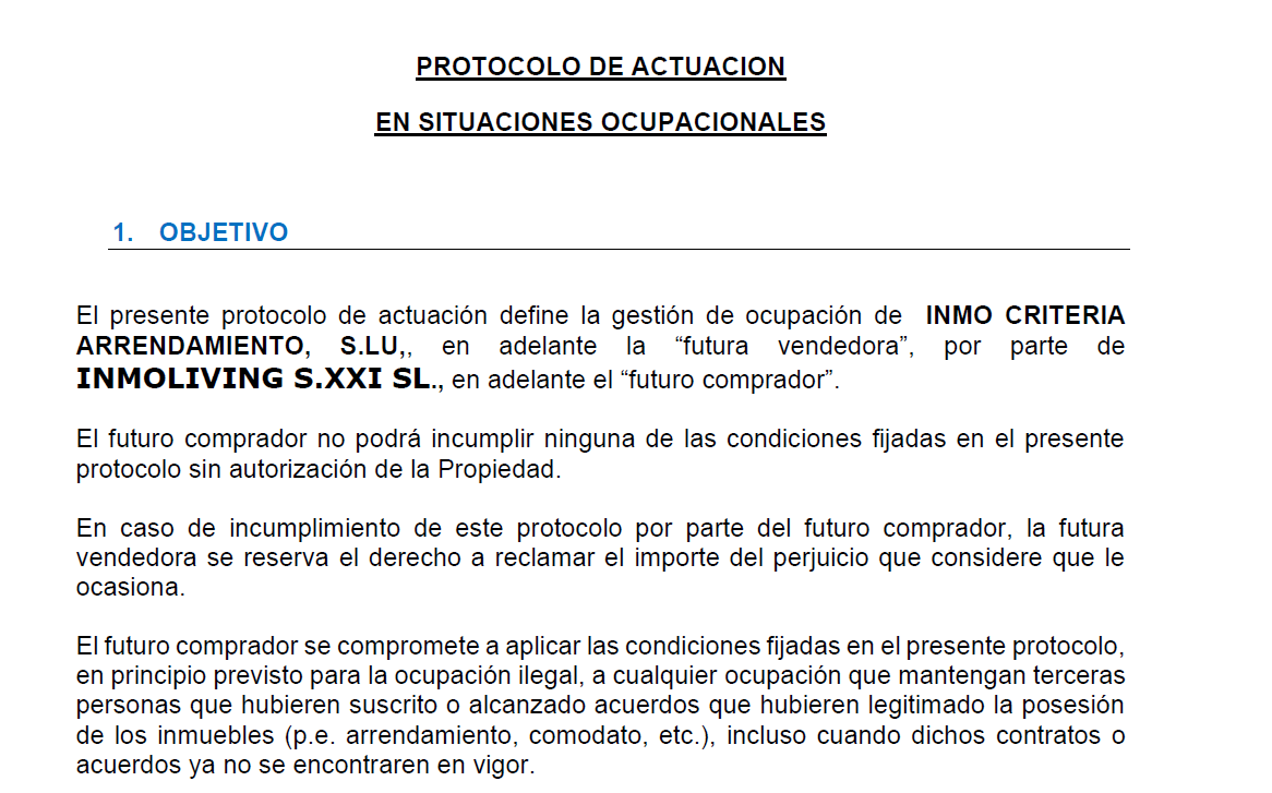 La empresa vendedora (Inmo Criteria Arrendamiento SLU) y la compradora (Inmoliving S.XXI SL) han pactado un detallado «Protocolo de Actuación en Situaciones Ocupacionales». Este documento tiene como objetivo definir cómo debe la parte compradora gestionar tanto las ocupaciones ilegales como los casos de ocupantes que, habiendo tenido un título legal (como un arrendamiento), ya no lo tienen.