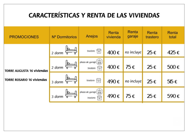 Precios Torre Augusta y Torre Rosario. Los importes indicados en RENTA TOTAL incluyen vivienda y, en su caso, garaje y/o trastero.