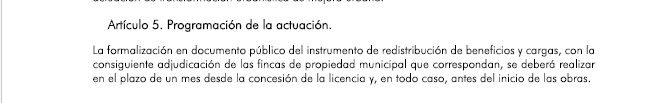 El contenido de dicho artículo es el siguiente: “La formalización en documento público del instrumento de redistribución de beneficios y cargas, con la consiguiente adjudicación de las fincas de propiedad municipal que correspondan, se deberá realizar en el plazo de un mes desde la concesión de la licencia y, en todo caso, antes del inicio de las obras”.