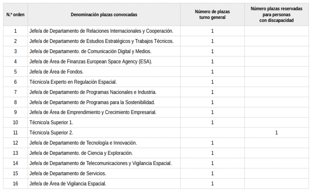 El Ministerio de Defensa y el de Ciencia, Innovación y Universidades han anunciado la convocatoria de un proceso selectivo para cubrir dieciséis (16) plazas de personal laboral fijo, fuera de convenio, para la Agencia Espacial Esañola, con sede en Sevilla, correspondiendo dichas plazas a la Oferta de Empleo Público de 2024 y a la Oferta de Empleo Público de 2025.