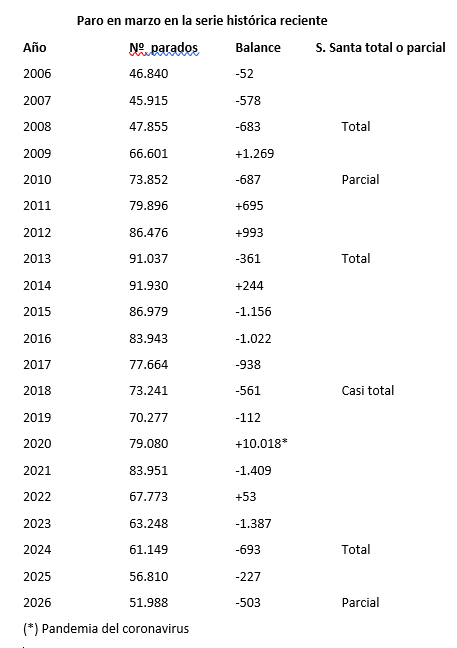 En los seis años con celebración de esta festividad religiosa en marzo (2008, 2010, 2013, 2018, 2024 y 2026), siempre hubo una reducción del desempleo, si bien de forma moderada. Las caídas en estos años oscilaron entre los -361 (2013) y los -693 (2024)