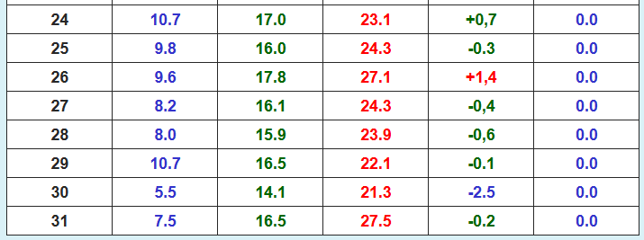 La temperatura máxima más alta (27,5 grados) se registró el día 31.