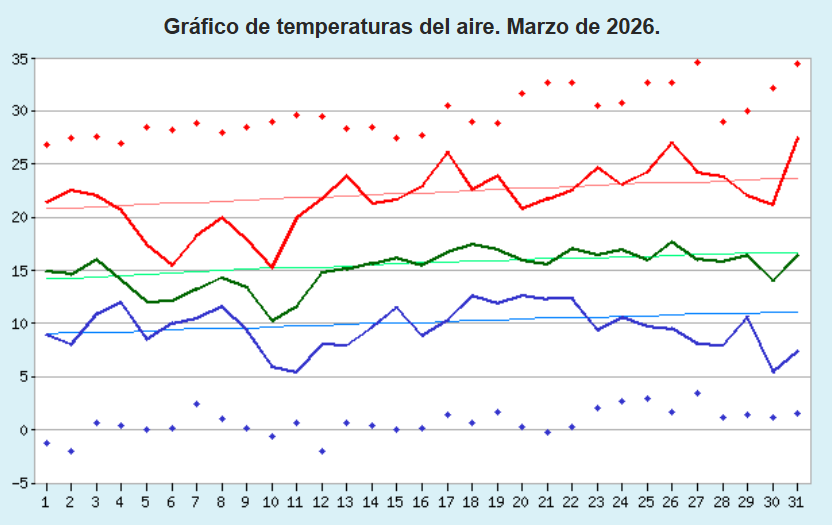 En cuanto a las temperaturas, la media mensual normal para marzo en nuestra ciudad es de 15,5 grados. Se han registrado 15,2 grados (-0,3 grados).