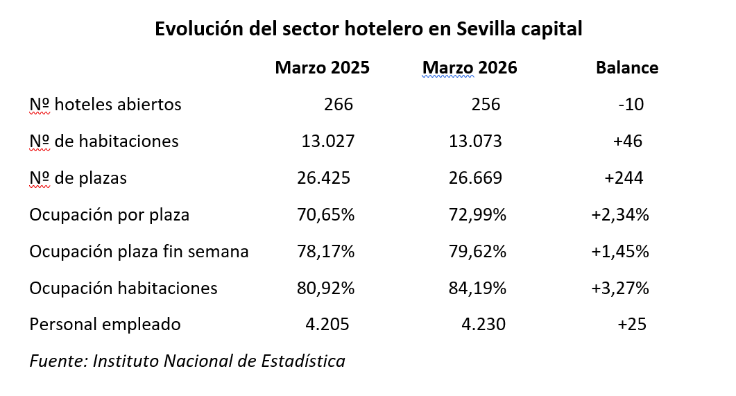 Al cruzar los datos de rentabilidad de la primavera de 2025 que difundió la patronal Exceltur con los datos de marzo de 2026 del Instituto Nacional de Estadística, podemos inferir algunas otras hipótesis sobre la situación del sector hotelero sevillano: