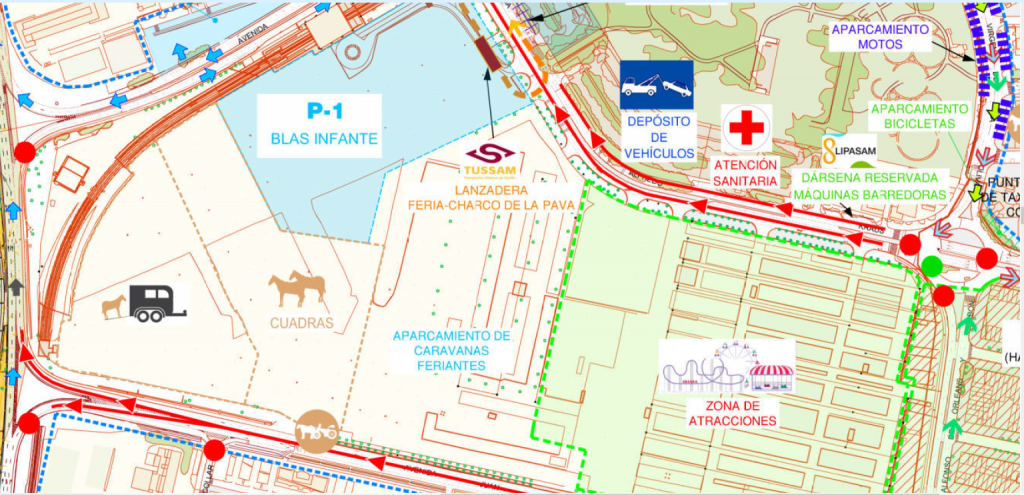 Se observa en el mapa del ámbito, extraído de una imagen satelital de Google Earth, cómo más o menos está dividido en dos mitades por la calle Alfonso de Orleans y Borbón. A la derecha de la misma en la imagen (punto cardinal Este) se aprecian las casetas del Real; a la izquierda (punto cardinal Oeste), la calle del Infierno; y a continuación de la misma el terreno que se destina durante la Feria a aparcamiento para las caravanas y vehículos de los feriantes, espacio para cuadras y carruajes y el aparcamiento número 1, tal como se detalla en el plano correspondiente al Plan de Movilidad del año en curso, bajo estas líneas.