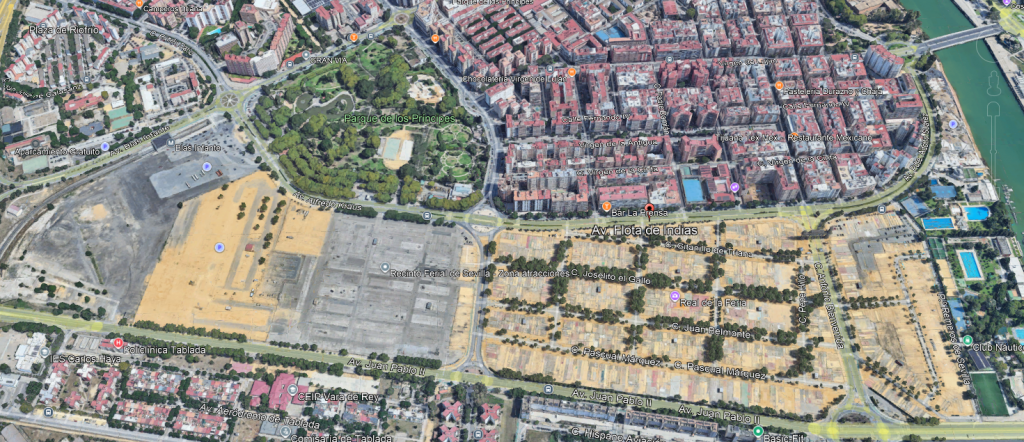 Nuestras mediciones, usando las herramientas de Google Earth, difieren de las municipales, aunque la suma de ambas zonas de la Feria viene a ser la misma: 82.000 m2 en números redondos para la calle del Infierno y 280.000 para el Real ( globalmente, también 362.000 m2).
