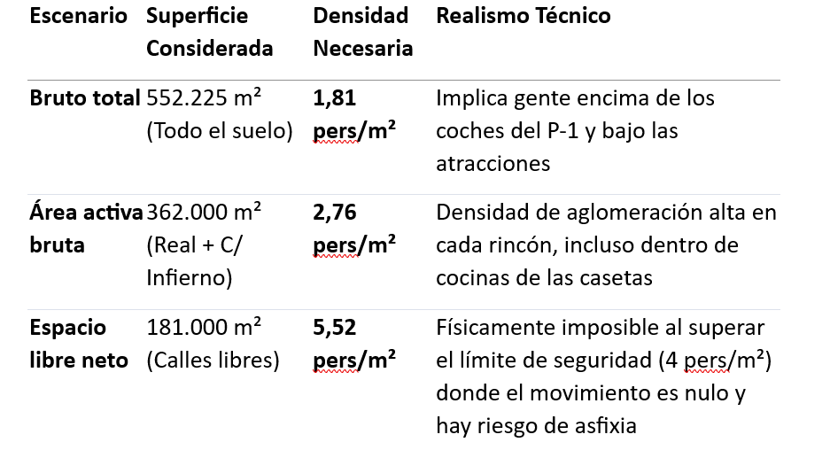 El millón de personas simultáneamente solo «cabría» si elimináramos todas las casetas, todas las atracciones y todos los coches del parking, dejando el medio millón de metros cuadrados del ámbito ‘Los Gordales’ del PGOU como un campo de albero vacío y apretujando a 2 personas en cada metro cuadrado. Con la configuración real de la Feria, el aforo simultáneo máximo razonable no supera el medio millón de personas.