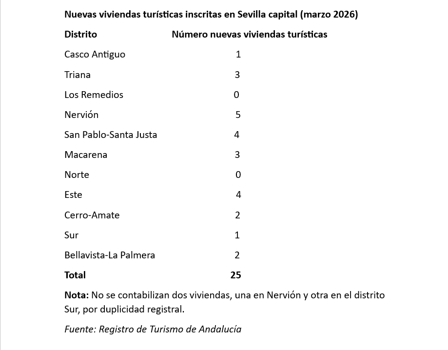 Cuando parecía que con la entrada del nuevo de año 2026 y las escasas ocho viviendas de uso turístico inscritas en enero, que seguían a las nueve de diciembre, se iniciaba un cambio de tendencia en este tipo de alojamientos en Sevilla capital, los repuntes posteriores de febrero (17 inscripciones) y ahora marzo (25) denotan que todavía hay mercado en este sector.