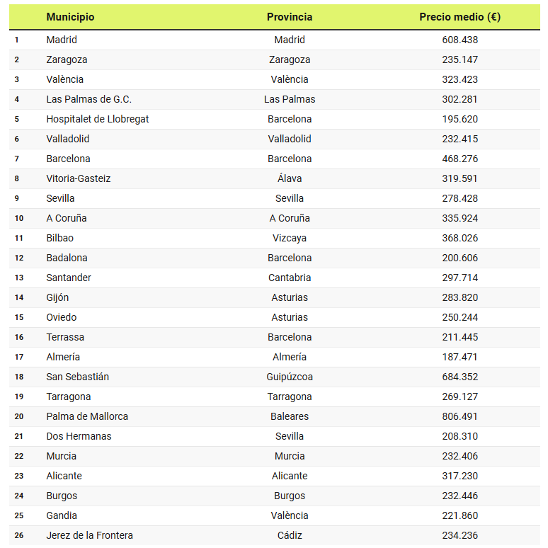 Tras la capital de España, se sitúan Zaragoza, con un precio medio cercano a los 235.000 euros; Valencia, con un promedio de 323.000 euros; y Las Palmas de Gran Canaria, donde los precios rondan los 302.000 euros.