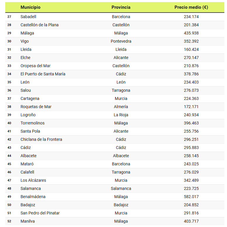 Tarragona y Palma de Mallorca cierran la lista de las 20 primeras localidades, con un promedio de 269.000 y 806.000 euros; seguidas de Dos Hermanas (Sevilla), Murcia, Alicante, Burgos, Gandía (Valencia), Jerez de la Frontera (Cádiz), Sabadell (Barcelona), Castellón de la Plana, Málaga y Vigo. En todos estos municipios los precios se mueven entre los 200.000 y los 235.000 euros, a excepción de Alicante (317.000 euros), Málaga (436.000 euros) y Vigo (352.000 euros).