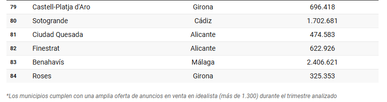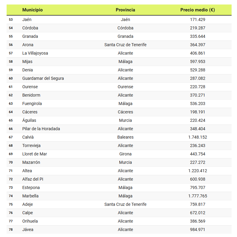 También por encima de 1,7 millones se encuentra la gaditana Sotogrande, mientras que la alicantina Altea cierra el ‘top 5’ con un precio medio de 1,22 millones. Por debajo del millón de euros, destacan los números de Jávea (Alicante), con un promedio cercano a 985.000 euros; seguida de Palma de Mallorca (806.000 euros), Estepona (Málaga), con casi 796.000 euros; y Adeje (Santa Cruz de Tenerife), con unos 760.000 euros de media.