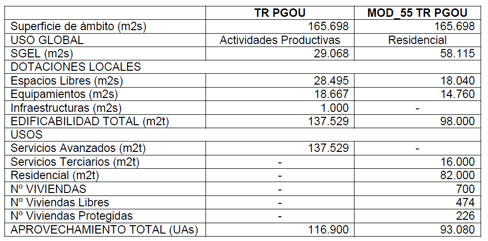 De 137.529 m2 previstos para servicios avanzados y ninguna vivienda se pasa a 700 viviendas y cero m2 para servicios avanzados. El siguiente cuadro refleja lo que estaba previsto en el «modelo de ciudad» plasmado en el Texto Refundido del Plan General de 2006 (TR PGOU) , según dice ahora Antonio Muñoz, y lo que el propio Muñoz impulsó con la recalificación mediante la Modificación Puntual Nº 55: