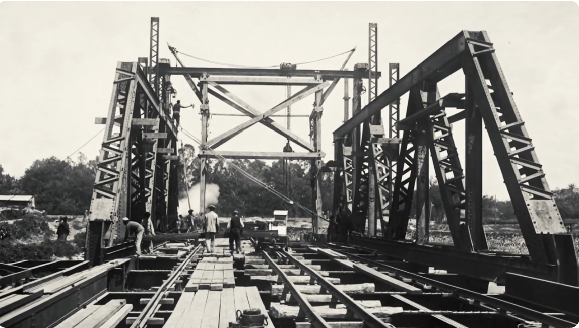 Proceso de construcción del puente de hierro, hace un siglo