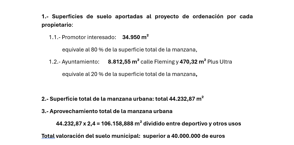 Es lo mismo que ya manifestamos y advertimos en las alegaciones que se presentaron al Estudio de Ordenación en cuanto a que el valor de las parcelas municipales las fijaba el promotor interesado en base a un valor catastral obsoleto. Y, además, ahora, sin realizar el proyecto de reparcelación que obligatoriamente en su tramitación tendría que exponerse al público. Lo que da poca transparencia al procedimiento y abre dudas sobre si se pretende de forma fraudulenta sustituir con esta parcelación para que se entreguen de forma inmediata esas parcelas, de suelo municipal, a cambio de superficies en futuros locales que no existen actualmente ya que se construirán en inmuebles que se espera construya el promotor en un futuro sin garantía alguna ni del tipo de construcción, ni de su calidad, ni de su ubicación dentro del edificio que se pretenden ubicar precisamente sobre las parcelas que son actualmente patrimonio municipal del suelo.