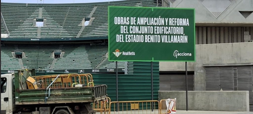 Un par de grandes carteles con el escudo del Betis y el logotipo de Acciona, la empresa constructora adjudicataria de las obras, han sido colocados en el interior de la explanada de propiedad municipal que lleva meses vallada por el club verdiblanco. Curiosamente, lo que hasta ahora se denominaba en el Estudio de Ordenación de los suelos ‘Nuevo Estadio Benito Villamarín’, pasa a llamarse ‘Conjunto Edificatorio del Estadio Benito Villamarín’, una expresión eufemística con la que se trata de englobar la mole anexa para uso terciario (hotel, comercios, bares…) y con la que de paso se elimina el carácter de novedoso al coliseo bético