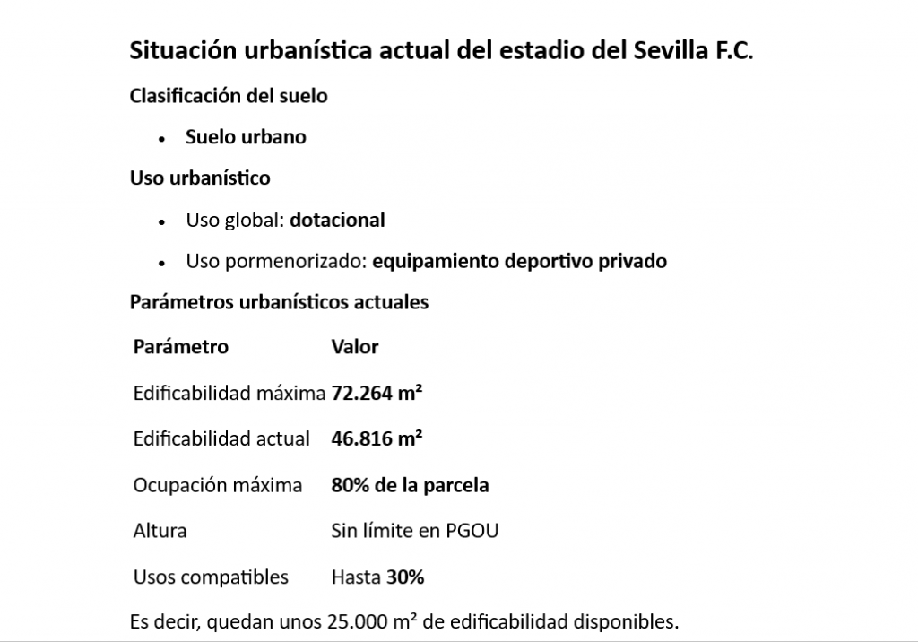 La ley obliga a compensar la pérdida. Por eso en el Estudio se propone crear 10.380 m² de nueva zona verde en la ciudad deportiva del club, sita en la carretera de Utrera, a seis kilómetros de distancia en coche. Esa superficie pasaría a ser municipal.
