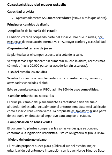 El contenido del documento, ya clasificado por la GUMA como planeamiento en trámite, es esencialmente el mismo que el del ‘Avance del Estudio de Ordenación’ fechado en julio del año 2024, ya que coinciden en el título y fecha, estructura del índice (introducción, antecedentes, diagnóstico, memoria de ordenación, gestión, cartografía), parámetros urbanísticos ( edificabilidad máxima: 72.264 m²; edificabilidad actual: 46.816 m² ; uso global dotacional deportivo privado; posibilidad de 30 % de usos compatibles ); objetivo del proyecto: permitir un nuevo estadio de ≈55.000 espectadores ampliando la huella del actual.