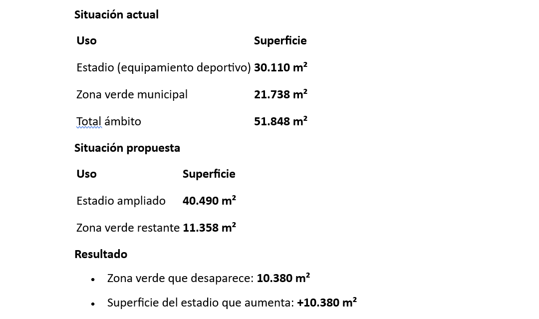 Por tanto, casi la mitad de la zona verde actual se incorpora al estadio.